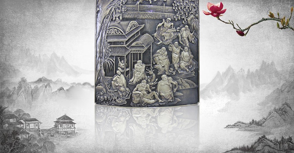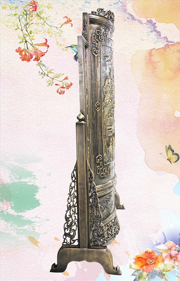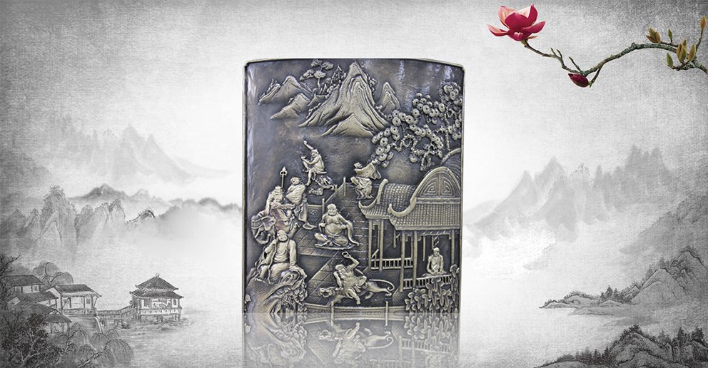 此幅青銅鑄造的《十八羅漢插屏》,是從一友人收藏的大約清中期紅木插屏上翻模制成的。整體上看玲瓏天成,布局精巧。從工藝上看雕法嫻熟,匠心獨(dú)具。特別是十八羅漢,個(gè)個(gè)活靈活現(xiàn)、栩栩如生。作者通過板塊錯(cuò)落的布局,使畫面生動起來,產(chǎn)生了上乘的視覺效果。